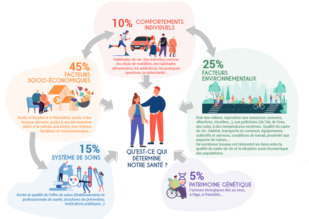 Sources : représentation de la Lalonde / Synthèse des travaux Barton et al. 2015 ; OMS 2010 ; Cantoreggi N. et al. 2010 – Pondération des déterminants de la santé en Suisse, université de Genève ; Los Angeles County Department of Public Health, 2013 ; How Social Economic Factors Affect Health